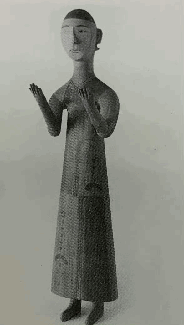 从战国中期的郢都时期启动,楚东谈主的木俑便形成了与朔方地面判然不同的作风,江陵楚墓中楚东谈主的专有木俑多为圆雕彩绘,或着绢丝衣物,或披垂假发,皆以榫卯结构装配昆玉,细腰束带,眉目逼真。无论男女,穿戴多趋于瘦长,领缘较宽,绕襟旋转而下,衣物多畸形华好意思。这些木俑与朔方宽袍博带且豪放雄武的陶俑人大不同,却与屈原诗词中“带长铗之陆离兮,冠切云之崔嵬,被明月兮佩宝璐”的华好意思楚风深切契合。