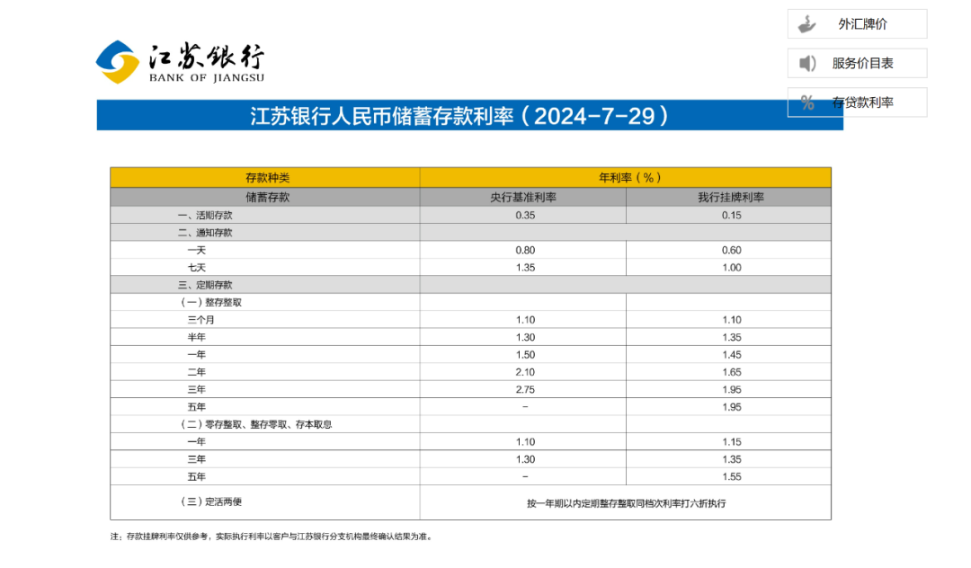 7月29日,江苏银行公布最新的进款挂牌利率表。记者防备到,该行进款利率的下调幅度为10-20个基点,三个月、六个月、一年期整存整取定存利率均下调10个基点,诀别下调至1.1%、1.35%、1.45%。两年期、三年期、五年期整存整取定存利率均下调20个基点,诀别下调至1.65%、1.95%、1.95%。